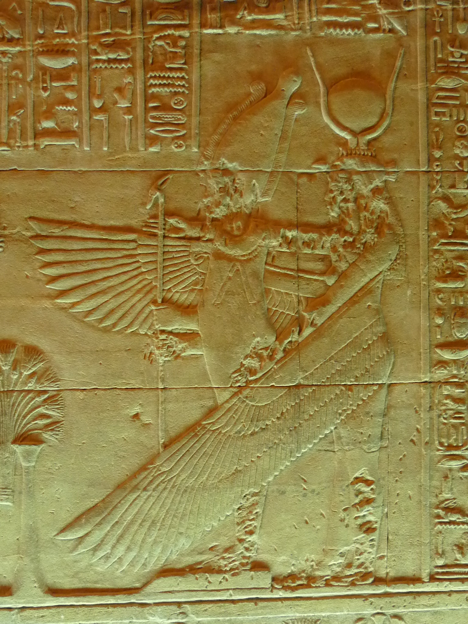 Bas relief image from Philae showing Isis resurrecting and embracing Osiris. Note the historic damage caused by Islamic iconoclasts.