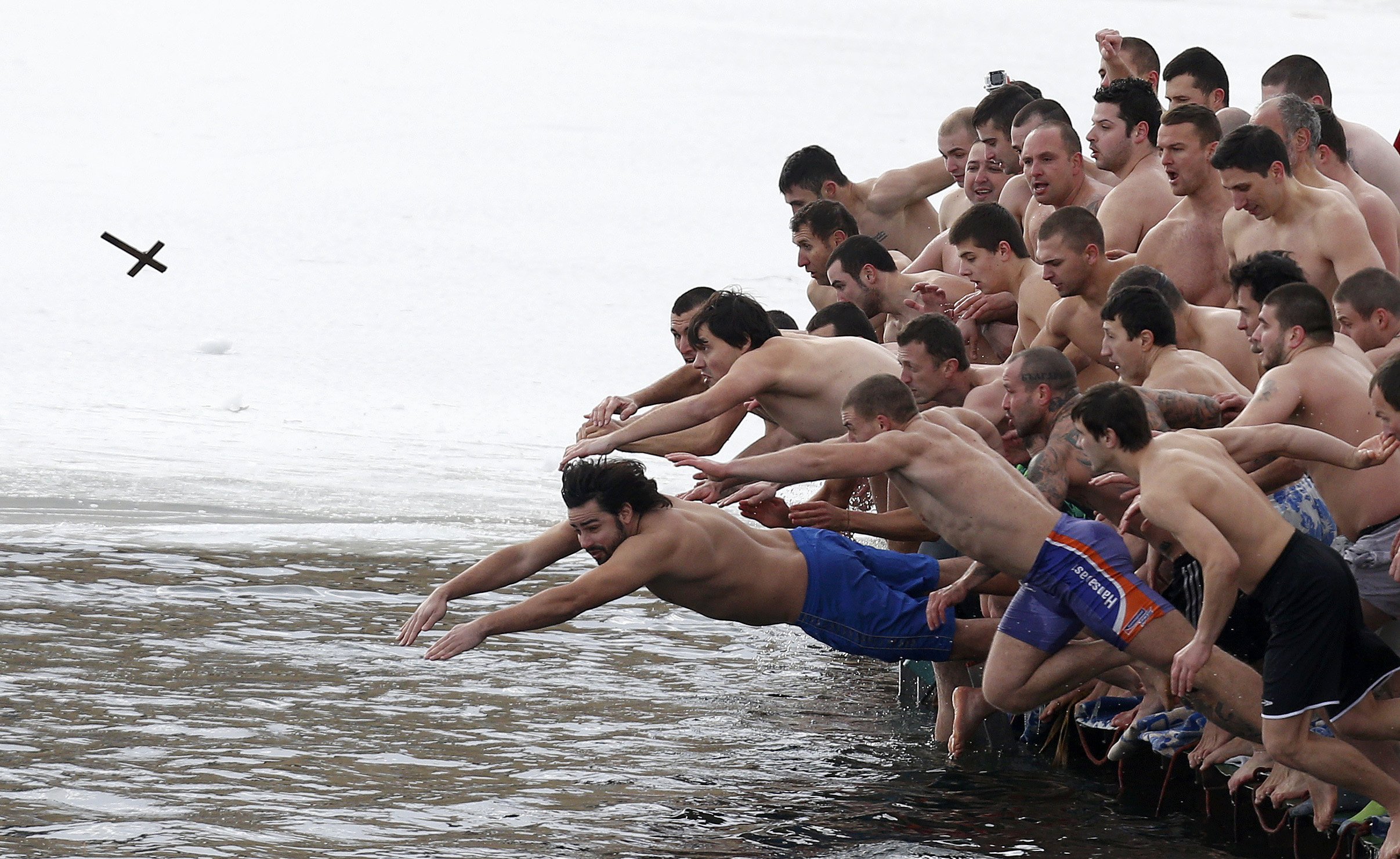 In Orthodox christianity, the ancient tradition of the Sanctification of the Waters at the festival of Epiphany (5th and 6th of January) is marked throughout the world by the popular custom of ‘diving for the cross’. The festival itself celebrates not just the ‘Theophany’ of Jesus to the gentiles but in particular among Orthodox Christians, his adult baptism by John the Baptist/the holy spirit (depending on which gospel tradition you go by).